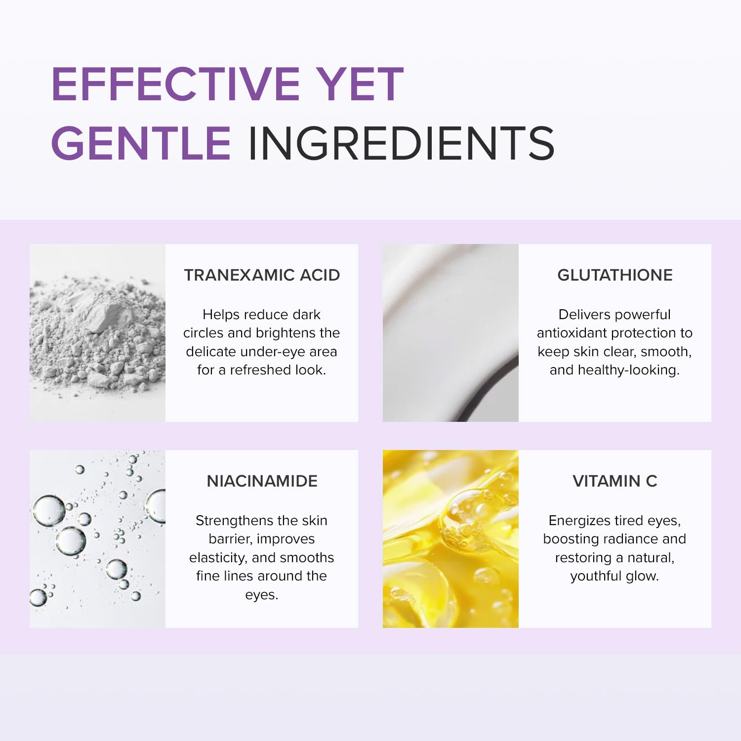 - The combination of tranexamic acid and glutathione, a powerful anti oxidant and melanin blocker brighten the dull tone aournd the eyes and improve uneven skin tone.
