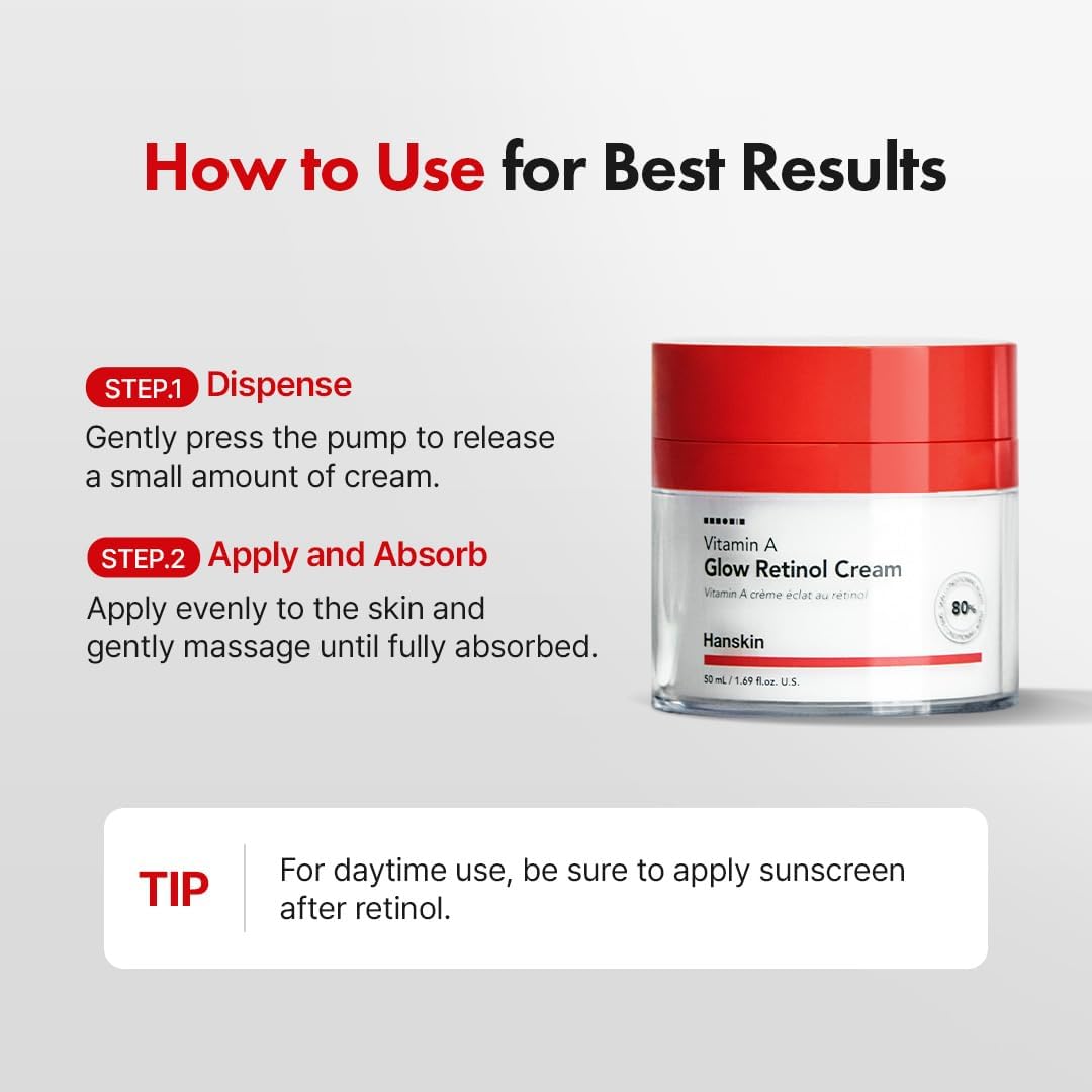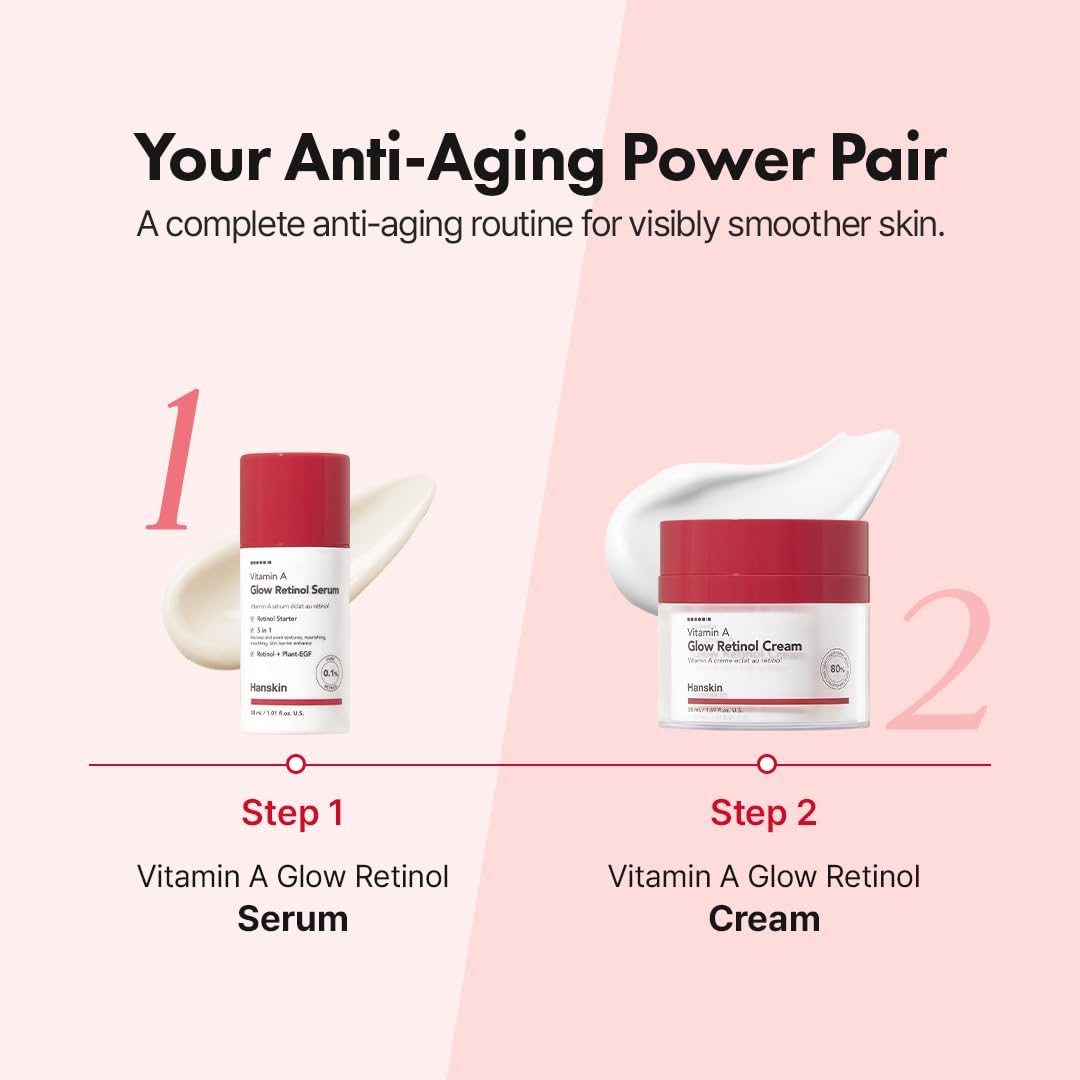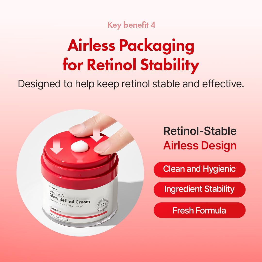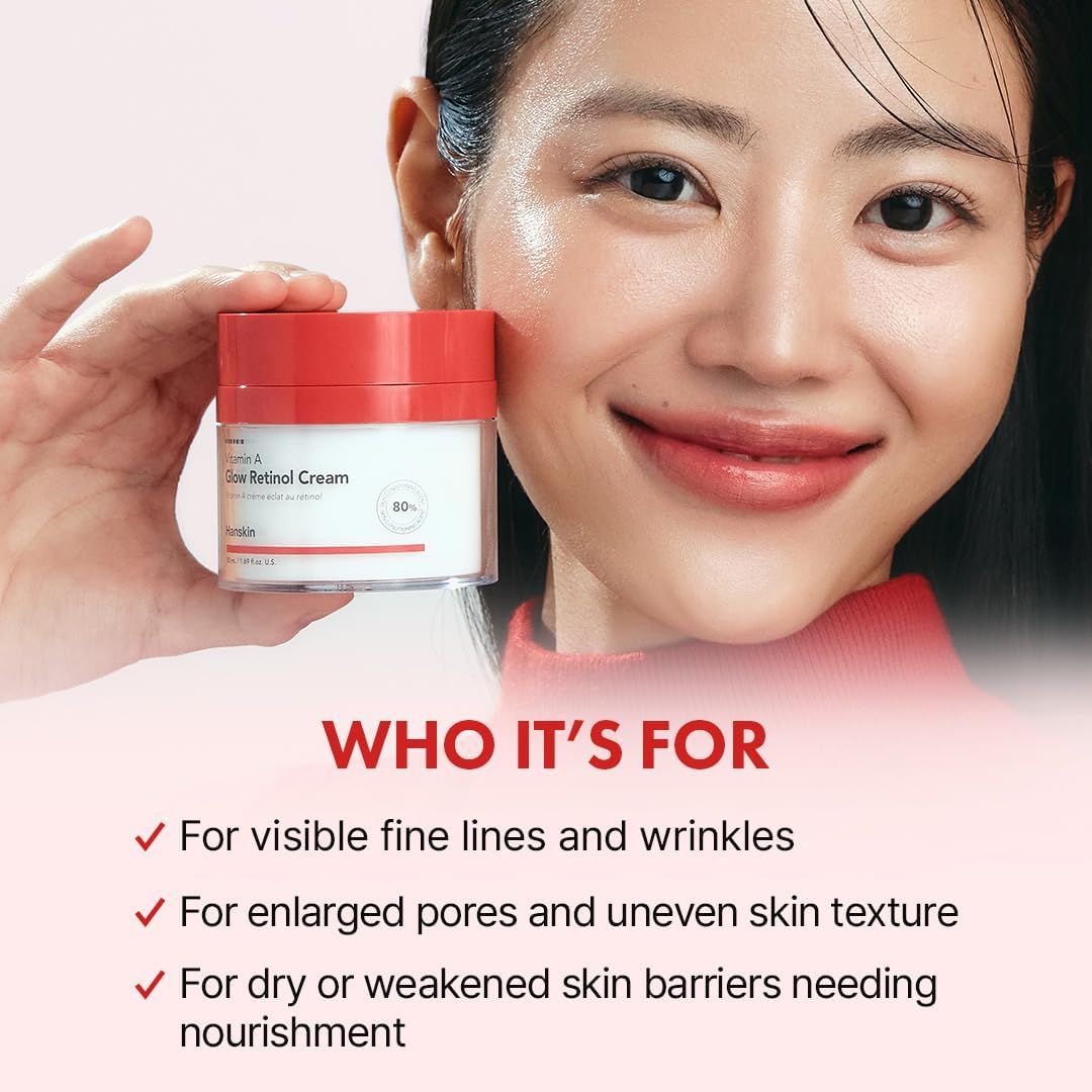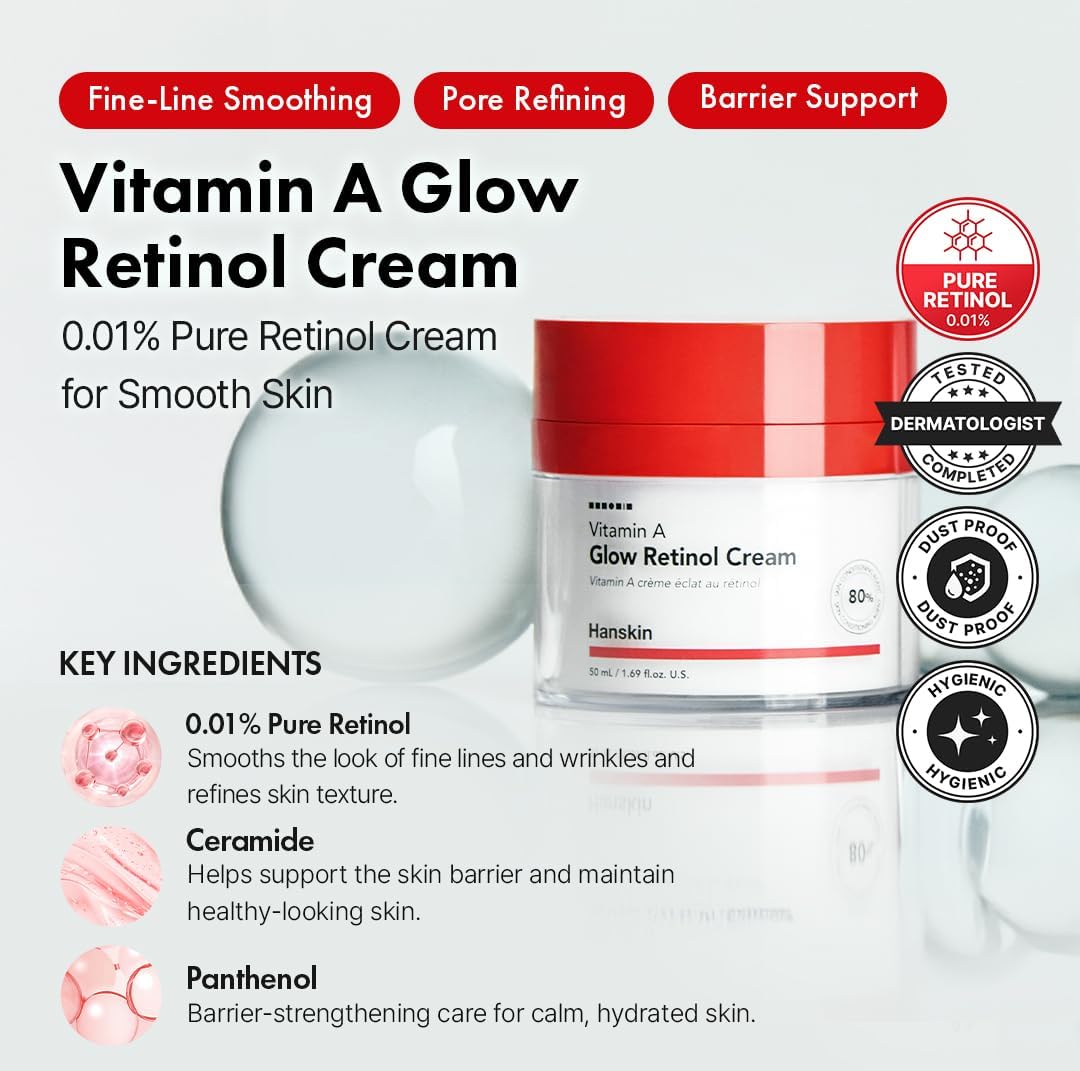 - RETINOL ANTI AGING CREAM : Hanskin’s Vitamin A Glow Retinol Cream is recommended by dermatologists as safe and effective. It helps reduce signs of aging such as fine lines and wrinkles for more youthful-looking skin. It is good for fine lines, wrinkles and uneven skin tone.