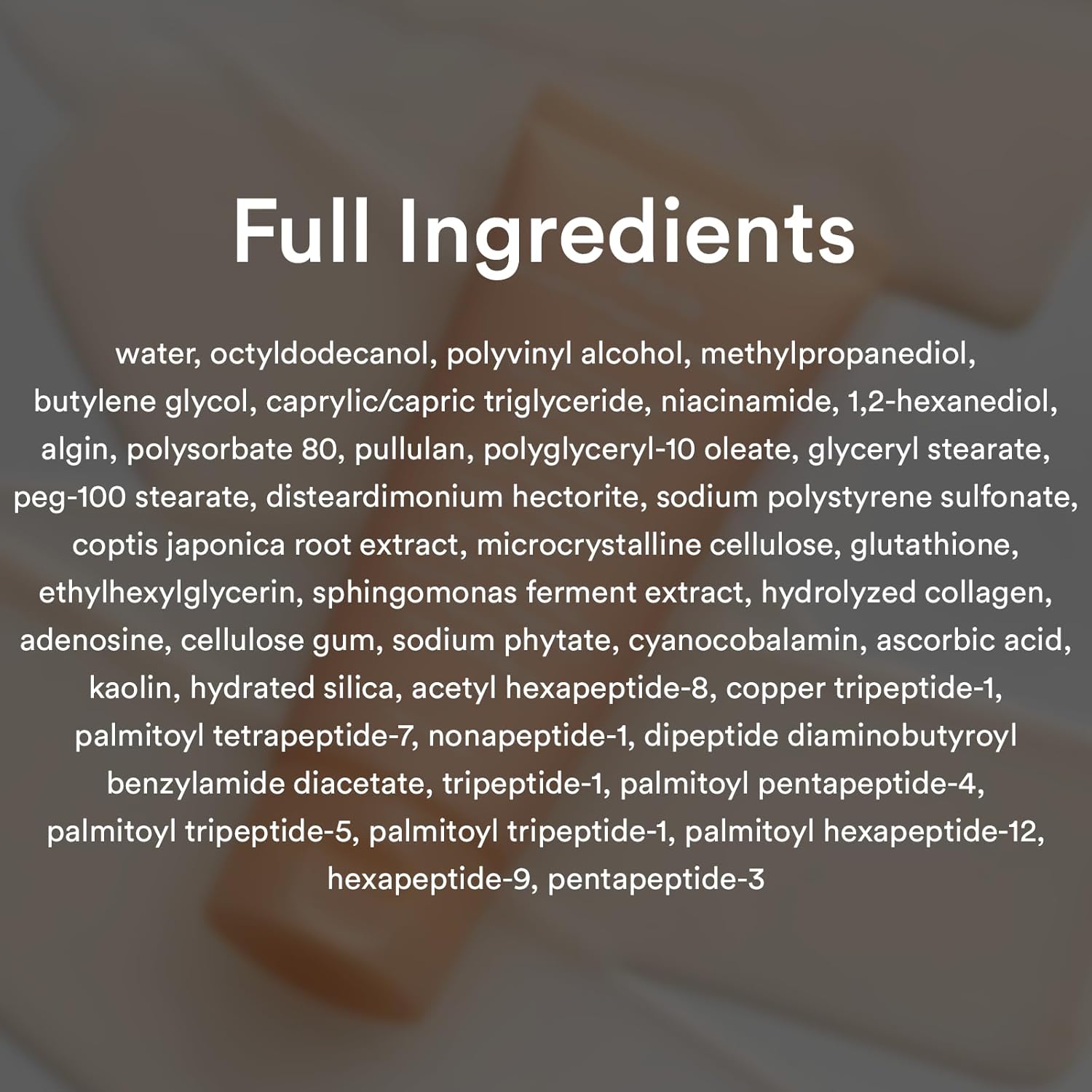 Water, Octyldodecanol, Polyvinyl Alcohol, Methylpropanediol, Butylene Glycol, Caprylic/Capric Triglyceride, Niacinamide, 1,2-Hexanediol, Algin, Polysorbate 80, Pullulan, Polyglyceryl-10 Oleate, Glyceryl Stearate, Peg-100 Stearate, Disteardimonium Hectorite, Sodium Polystyrene Sulfonate, Coptis Japonica Root Extract, Microcrystalline Cellulose, Glutathione, Ethylhexylglycerin, Sphingomonas Ferment Extract, Hydrolyzed Collagen, Adenosine, Cellulose Gum, Sodium Phytate, Cyanocobalamin, Ascorbic Acid, Kaolin, Hydrated Silica, Acetyl Hexapeptide-8, Copper Tripeptide-1, Palmitoyl Tetrapeptide-7, Nonapeptide-1, Dipeptide Diaminobutyroyl Benzylamide Diacetate, Tripeptide-1, Palmitoyl Pentapeptide-4, Palmitoyl Tripeptide-5, Palmitoyl Tripeptide-1, Palmitoyl Hexapeptide-12, Hexapeptide-9, Pentapeptide-3