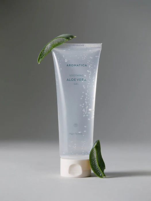 Tube of Aromatica Soothing Aloe Vera Gel on a neutral background