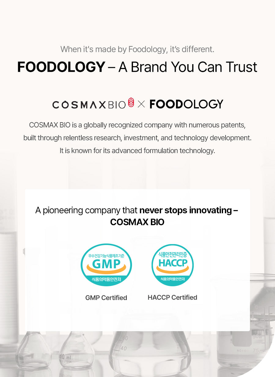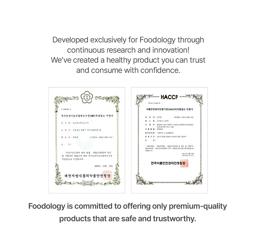 • ABOUT FOODOLOGY - FOODOLOGY is a highly esteemed brand that prioritizes the satisfaction of our customers, and produces top-quality health functional foods with the highest quality ingredients, accurate formulation, and production processes. We collaborate with health experts to ensure the production of honest and trustworthy health-functional foods.