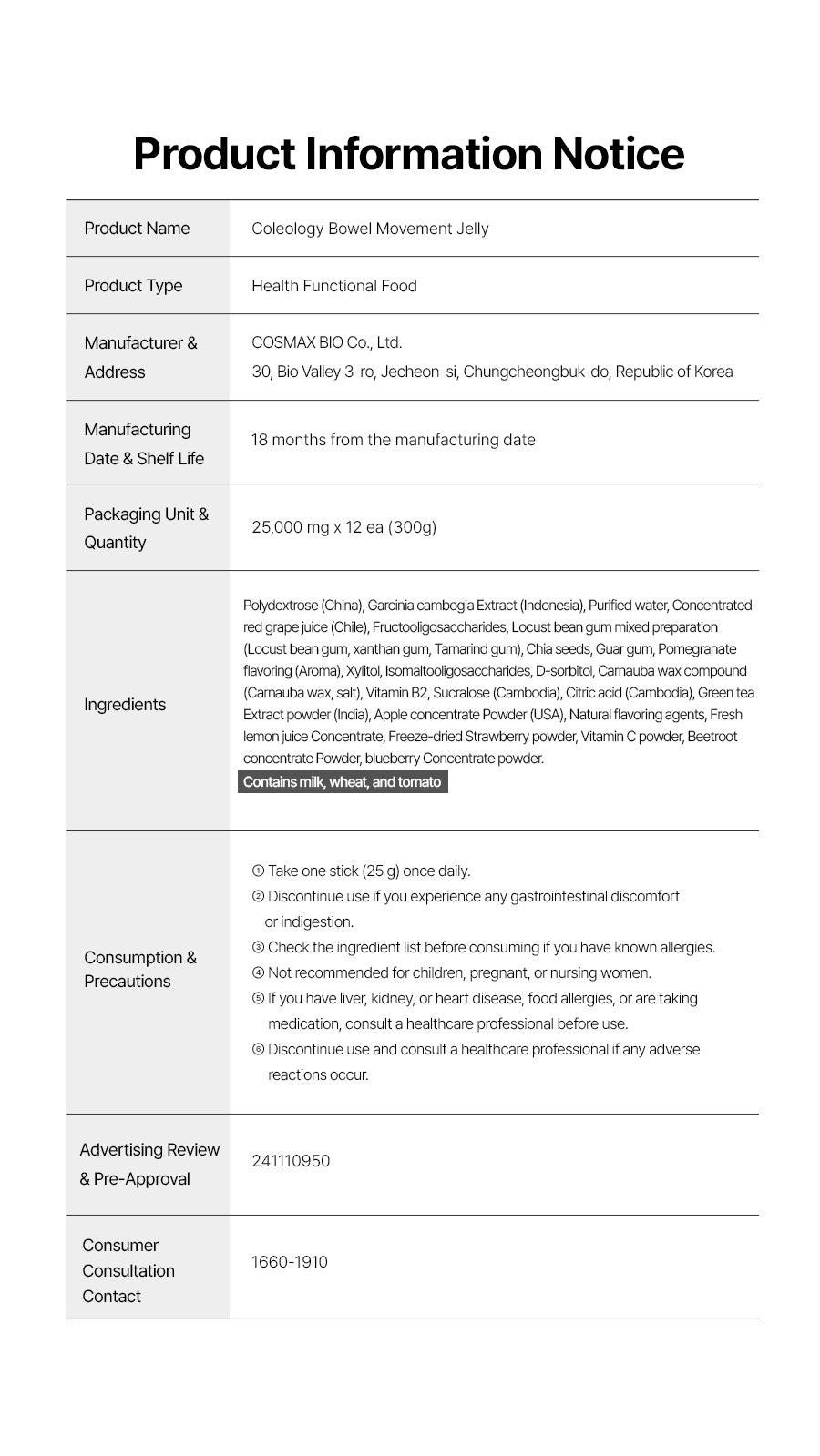 Purified Water, Fructooligosaccharide, Coconut Jelly(Nata de Coco){Coconut Jelly(Nata de Coco), Surgar, Purified Water, Citric Acid}, Green Apple Concentrate, Xylitol, Small Molecular Fish Collagen(300 Da / Small Molecular Fish Collagen Peptide), Locust Bean Gum Concoction(Locust Bean Gum, Xanthan Gum, Glucose, Agar, Tamarind Gum), β-Cyclodextrin, Fragrance(Green Apple Flavor), Frozen Dried Centella Asiatica Leaf Powder, Citric Acid, DL-Malic Acid, Enzymatically Modified Stevia, Trisodium Citrate, Carrageenan Concoction(Carrageenan, Potassium Chloride), Milk Protein Concentrate Powder, Vitamin Mineral Concoction[Calcium Phosphate, Dibasic, L-Ascorbic Acid, dl-α-Tocopherol Concoction(dl-α-Tocopheryl Acetate, Food Starch Modified, Glucose Syrup Powder, Silicon Dioxide), Ferrous Fumarate, Nicotinamide, Zinc Oxide, Vitamin A Concoction{Glucose Syrup Powder, Gum Arabic, Corn Starch, VitaminA in Oil, dl-α-Tocophero(dl-α-Tocopherol)}, Calcium Pantothenate, Pyridoxine Hydrochloride, Thiamine Hydrochloride, Riboflavin, Folic Acid, Biotin], Liposome L-Ascorbic Acid Concoction(L-Ascorbic Acid, Dextrin, Glycerin, Sunflower Lecithin), Elastin Extract Mixed Powder, Hyaluribuc Acud Concoction(Trehalose, Hyaluronic Acid), Salmon Mily Extract Powder, Dried Yeast, Biotin Concoction(Calcium Phosphate, Dibasic, Biotin), Amino Acid Mixed Powder, Vitamin A Concoction{Glucos Syrup Powder, Gum Arabic, Corn Starch, VitaminA in Oil, dl-α-Tocopherol(dl-α-Tocophero)}