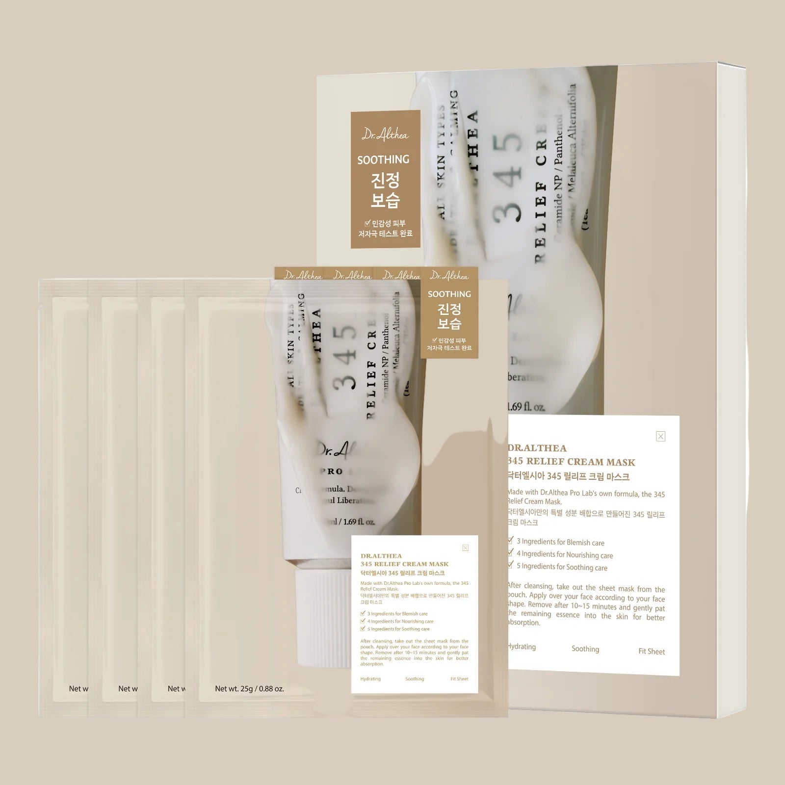 345 Relief Cream mask sheet contains 3 blemish-relief ingredients, 4 nourishing ingredients, and 5 soothing care ingredients, rapidly calming the skin while supporting its regeneration.
