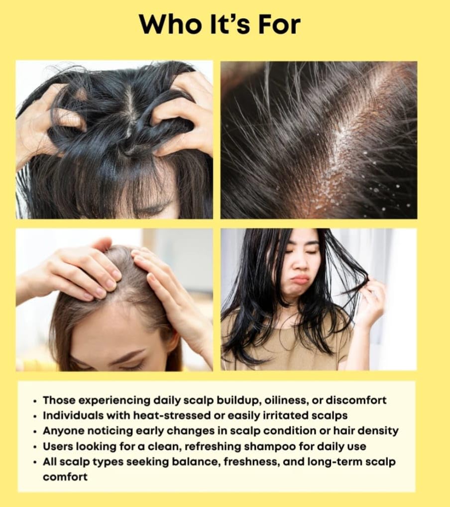- Gently cleanses the scalp while helping revive tired roots,leaving the scalp feeling fresh, clear, and balanced after every wash.