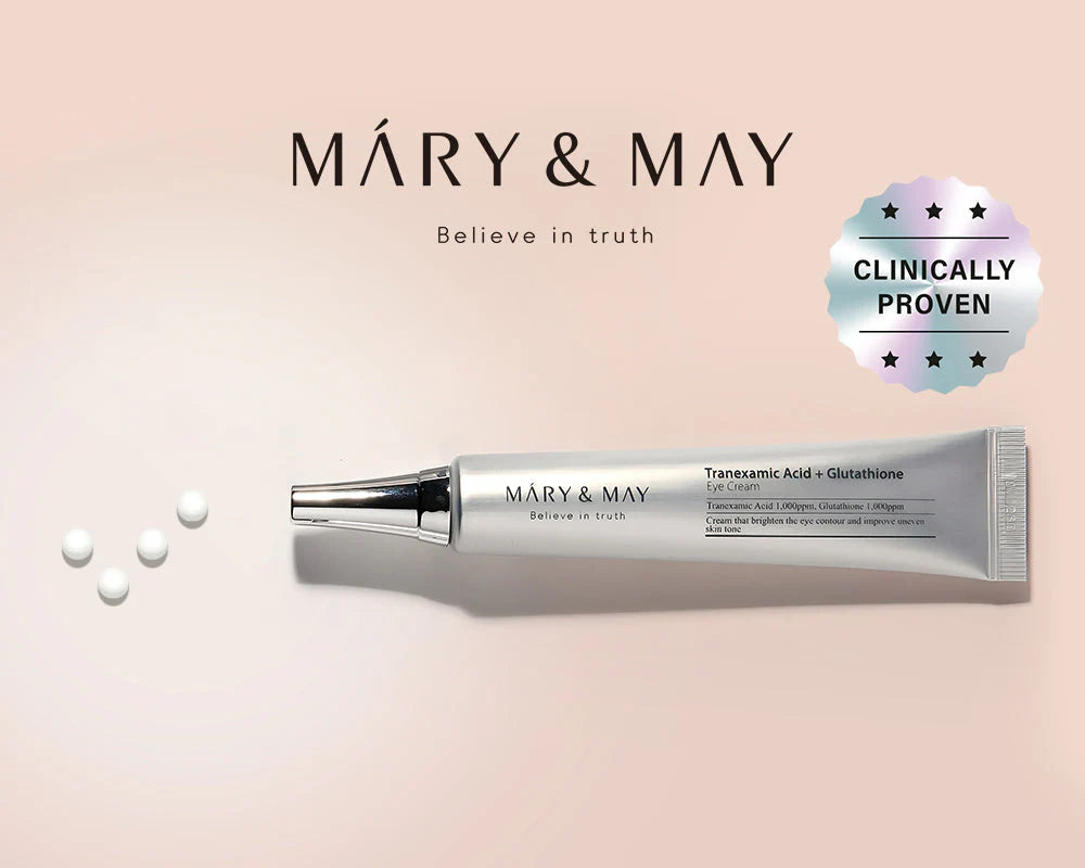 Mary&May Tranexamic Acid + Glutathione Eye cream, 1,000ppm tranexamic acid, 1,000ppm Glutathione for intensive care for dark circles in the eye contour.
